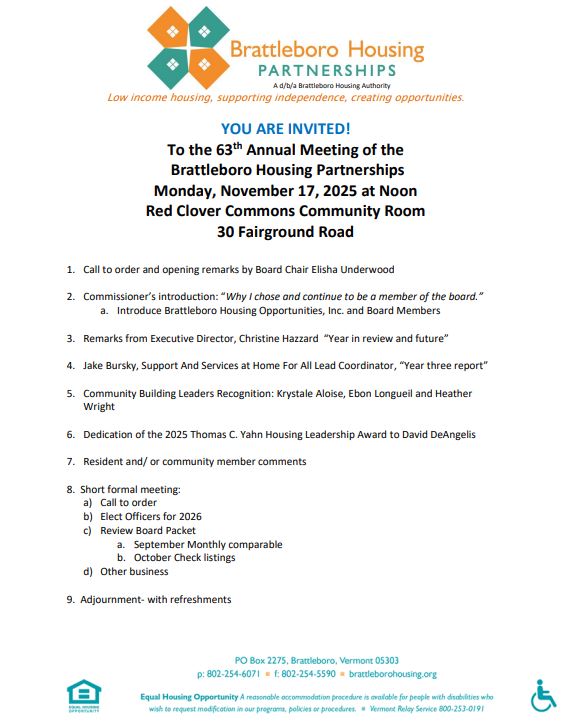 Brattleboro Housing Partnerships will be submitting a Moving to Work Supplemental plan on January 4, 2025 as part of its annual plan. The plan has been available for review and comment since August 23, 2024, at brattleborohousing.org. It will ask for waivers to allow the following changes: 1 the ability to conduct our own HQS inspections on our buildings, 2 the ability to exclude paid child support payments from income for rent calculation purposes, 3 change the medical deductions to eliminate over the counter and other expenses for the allowable deductions and increase the number of people eligible for deductions by eliminating the need to meet a threshold. A public hearing will be held Monday October 28 at 5:00 at Hayes Court on Garfield Drive. Comments can be submitted to bhp @brattleborohousing.org or 802-254-6071.